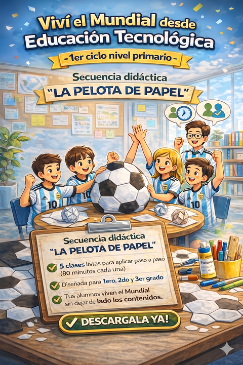 ⚽ Secuencia didáctica de 5 clases para Educación Tecnológica de 1°, 2° y 3° grado. Tus alumnos descubren que la pelota del Mundial 2026 es un objeto tecnológico y construyen la suya entre todos. Incluye guía docente, ficha del alumno, rúbrica y diplomas. ¡Lista para llevar al aula!